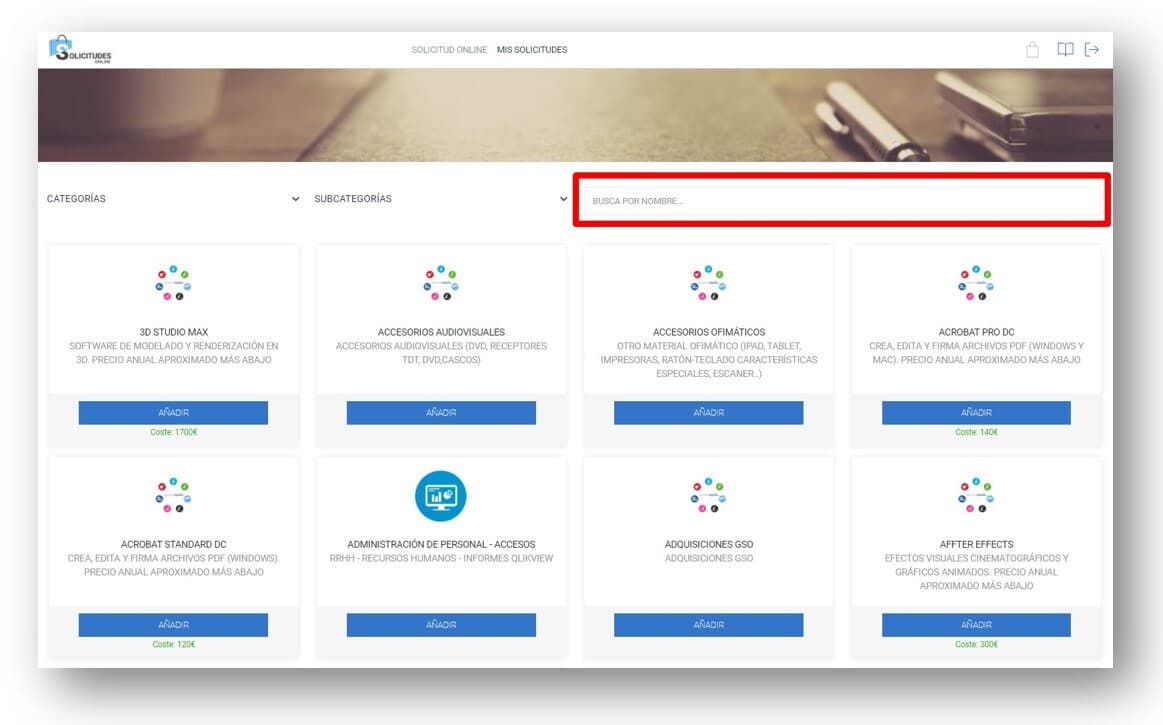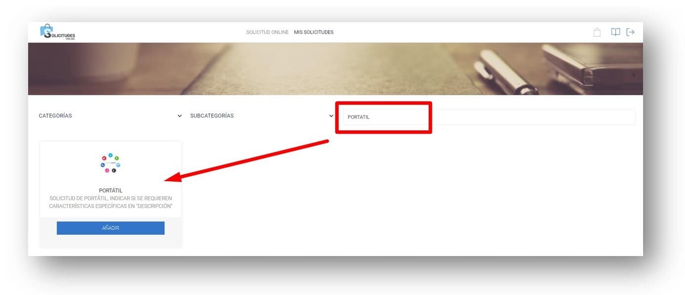 En el buscador (campo Busca por nombre) introduce el texto PORTATIL. Verás que se filtran los resultados según el texto introducido y se muestra el recurso que tienes que utilizar para solicitar un portátil.