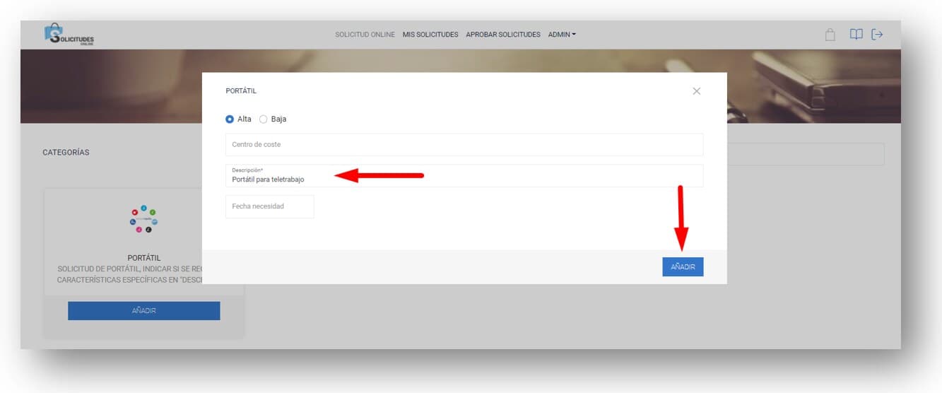 Pulsa el botón AÑADIR y en la ventana que se abre a continuación, completa el campo DESCRIPCIÓN con el texto «Portátil para teletrabajo». Una vez introducido el texto, pulsa el botón AÑADIR.