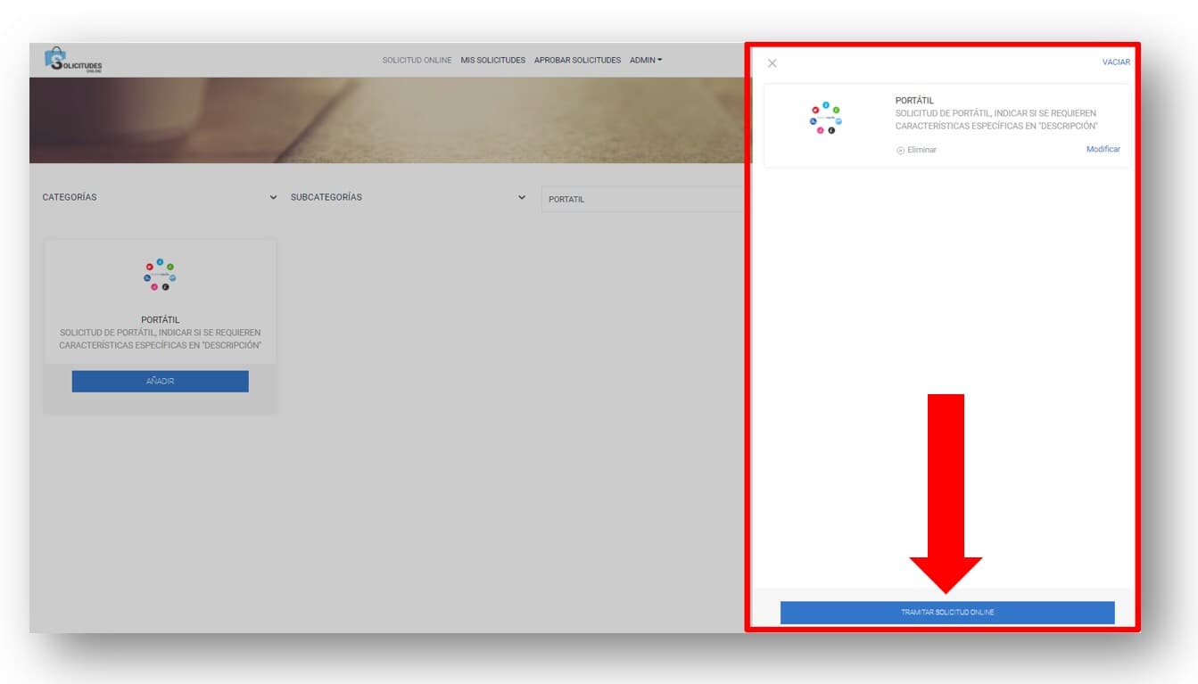 A continuación, verás que se muestra una ventana en la parte lateral derecha con el recurso PORTATIL que acabas de añadir. Pulsa el botón TRAMITAR SOLICITUD ONLINE para tramitar la solicitud.