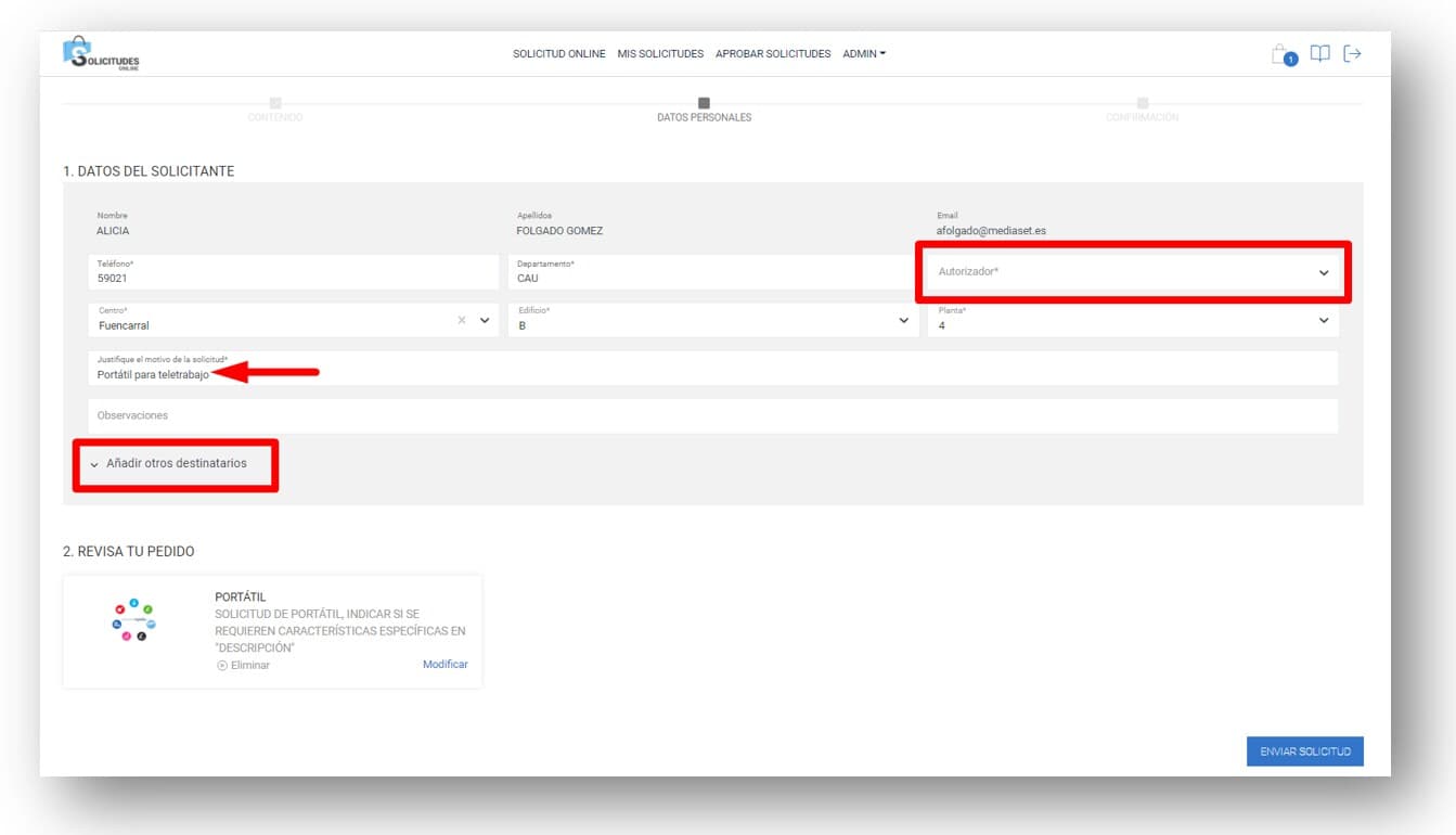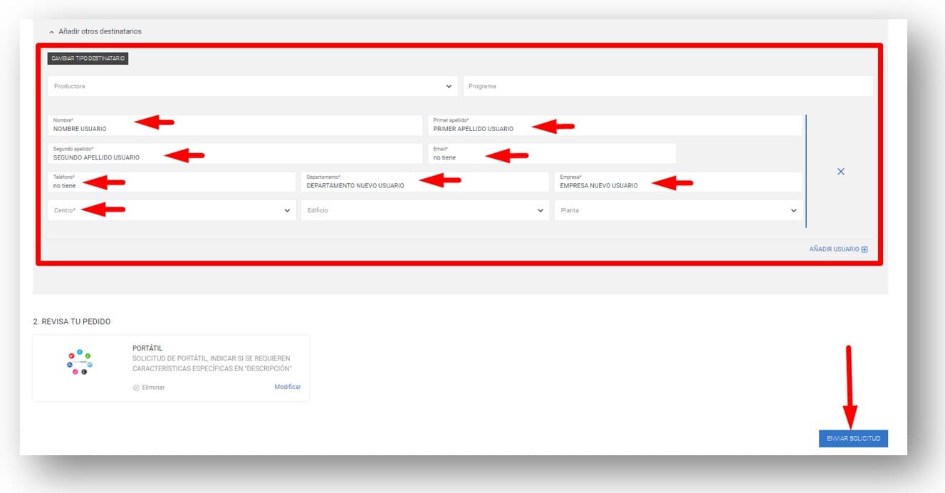 Informar todos los campos obligatorios y pulsar el botón ENVIAR SOLICITUD para tramitarla. (NOTA: si la solicitud es para varios usuarios nuevos, antes de enviar la solicitud, se pueden añadir tantos usuarios como necesitemos pulsando el botón +AÑADIR USUARIO)