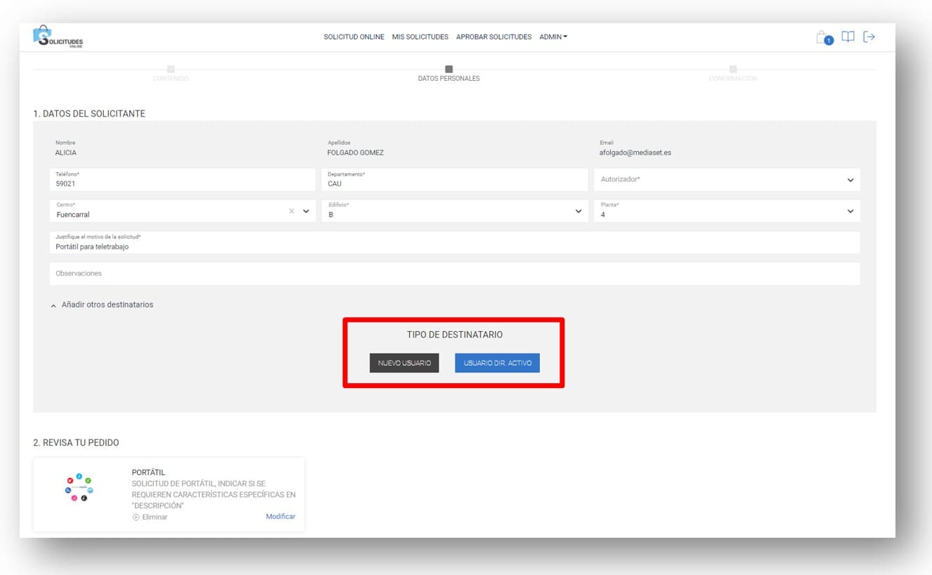 Si el destinatario de la solicitud es un usuario que todavía no está dado de alta en el Directorio Activo de Mediaset (es decir, que todavía no tiene usuario y contraseña de red), pulsar el botón NUEVO USUARIO para tramitar la solicitud.Al pulsar el botón NUEVO USUARIO, se despliega el área para introducir los datos del nuevo usuario.