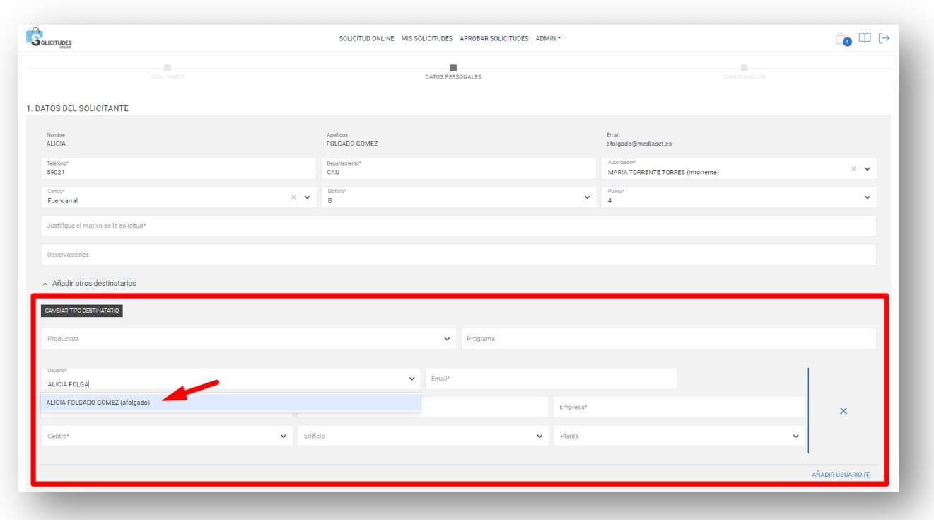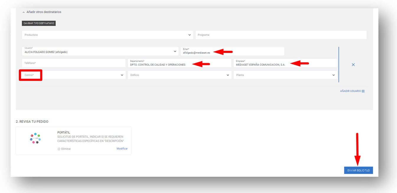 Al seleccionar el usuario del listado, se informan automáticamente los campos EMAIL, DEPARTAMENTO y EMPRESA. Informar además el campo obligatorio CENTRO y pulsar el botón ENVIAR SOLICITUD para tramitarla. (NOTA: si la solicitud es para varios usuarios del directorio activo, antes de enviar la solicitud, se pueden añadir tantos usuarios como necesitemos pulsando el botón +AÑADIR USUARIO)