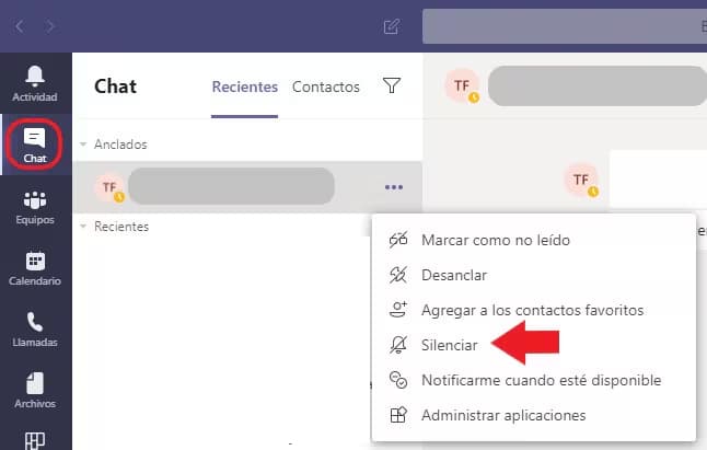 Selecciona Chat del menú izquierdo de la aplicación para ver la lista de chats. Coloca el ratón encima del nombre del chat que quieras silenciar, selecciona Más opciones ··· > Silenciar.
