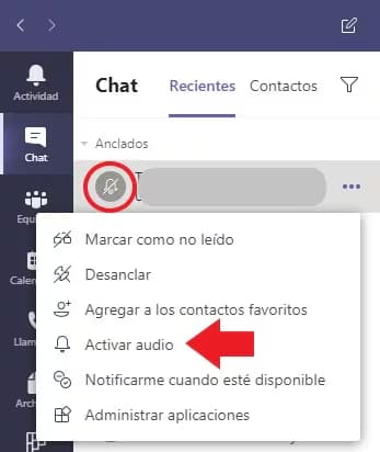 Al silenciar un chat, se mostrará un icono a la izquierda del nombre del chat para recordarte que el chat se ha silenciado. Puedes volver a activar las notificaciones, seleccionando Más opciones ··· > Activar el audio