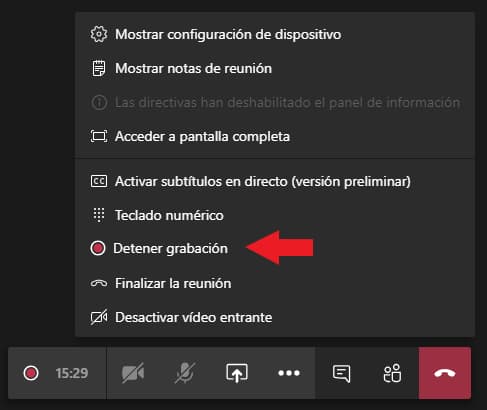 Puedes detener la grabación de la reunión en en cualquier momento seleccionando el botón Más acciones > Detener la grabación