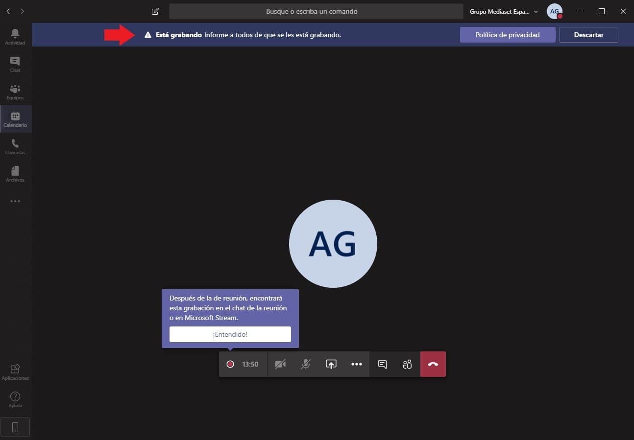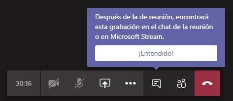 Todos los participantes de la reunión reciben una notificación de que la grabación se ha iniciado y de que quedará disponible para todos en el chat de la reunión o Microsoft Stream al finalizarla.