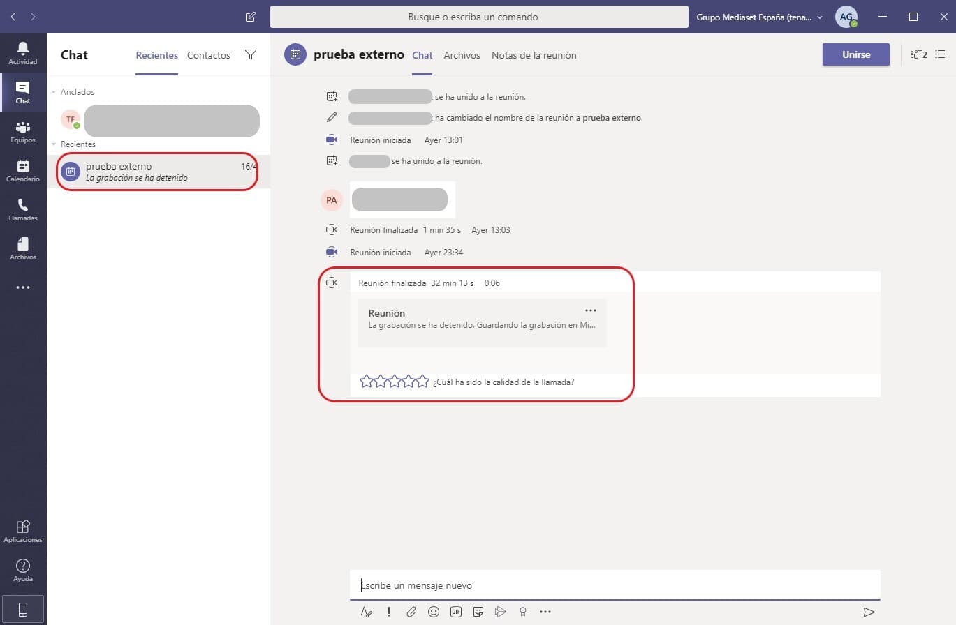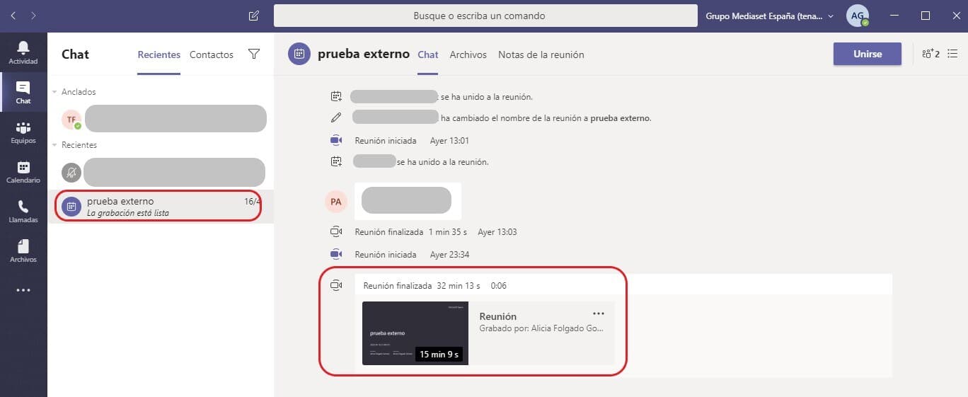 Al finalizar la reunión, la grabación queda disponible para todos los participantes en el chat de la reunión lista para su reproducción.