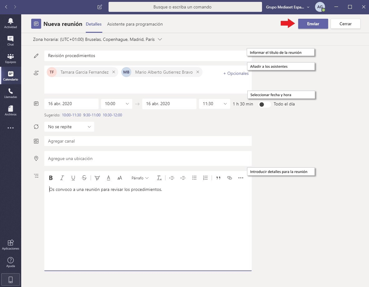 - Desde el menú izquierdo de accesos directos de la aplicación, selecciona la opción de Calendario. Haz clic en el botón que se muestra en la esquina superior derecha Nueva reunión