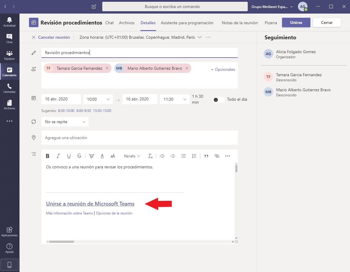 Una vez enviada la convocatoria de reunión, las asistentes recibirán un corre electrónico con el link para unirse a la reunión en la fecha y hora programada.
